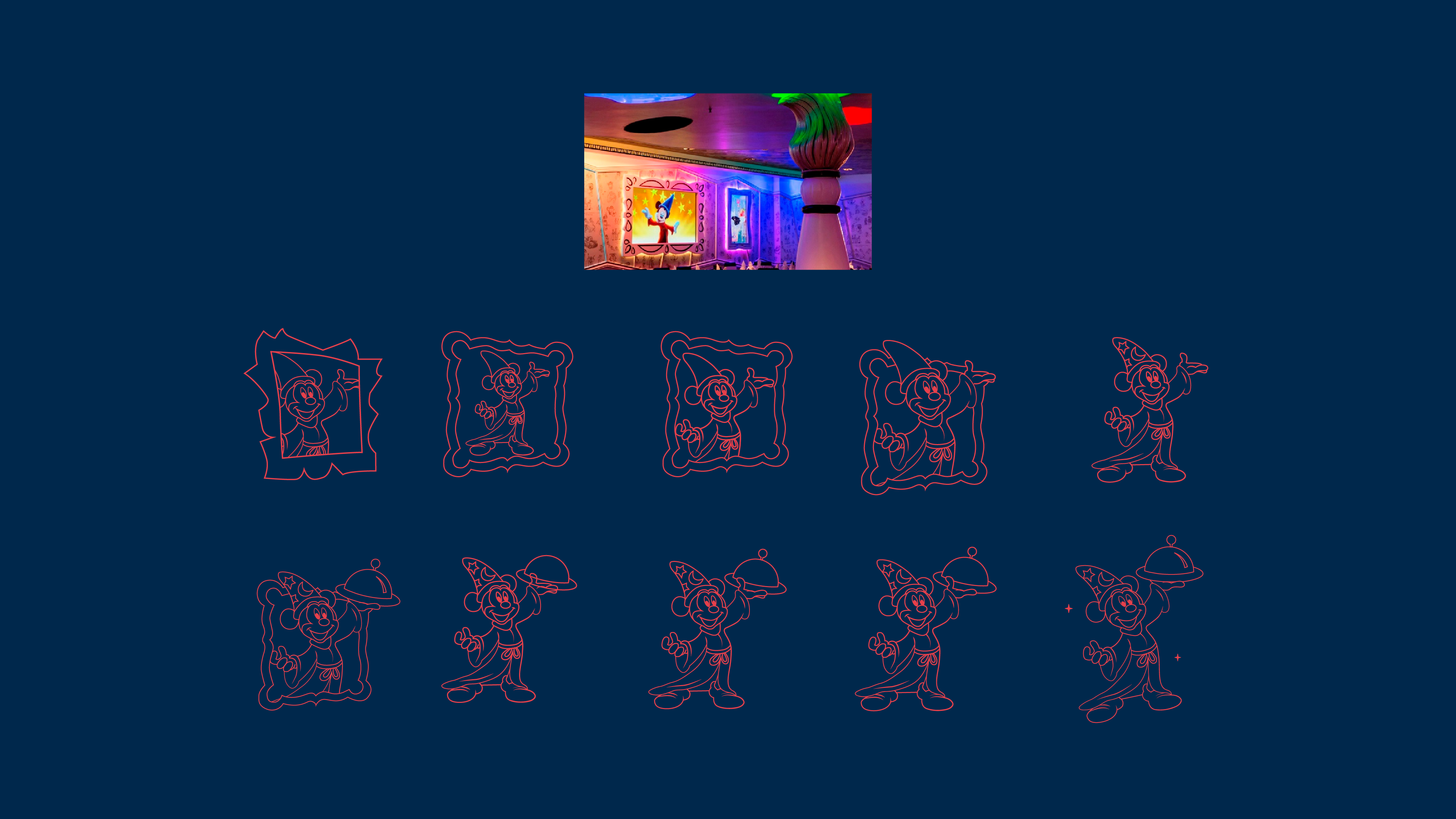 Disney Cruise Line’s interactive deck allows guests to explore each deck by tapping on venue pins—such as restaurants, dessert shops, and major landmarks—which reveal themed icons and supporting illustrations called “flourishes.” While the pins were designed to provide quick, intuitive recognition of each location, the flourishes offered additional context and storytelling, helping guests visually understand the character and atmosphere of each venue.