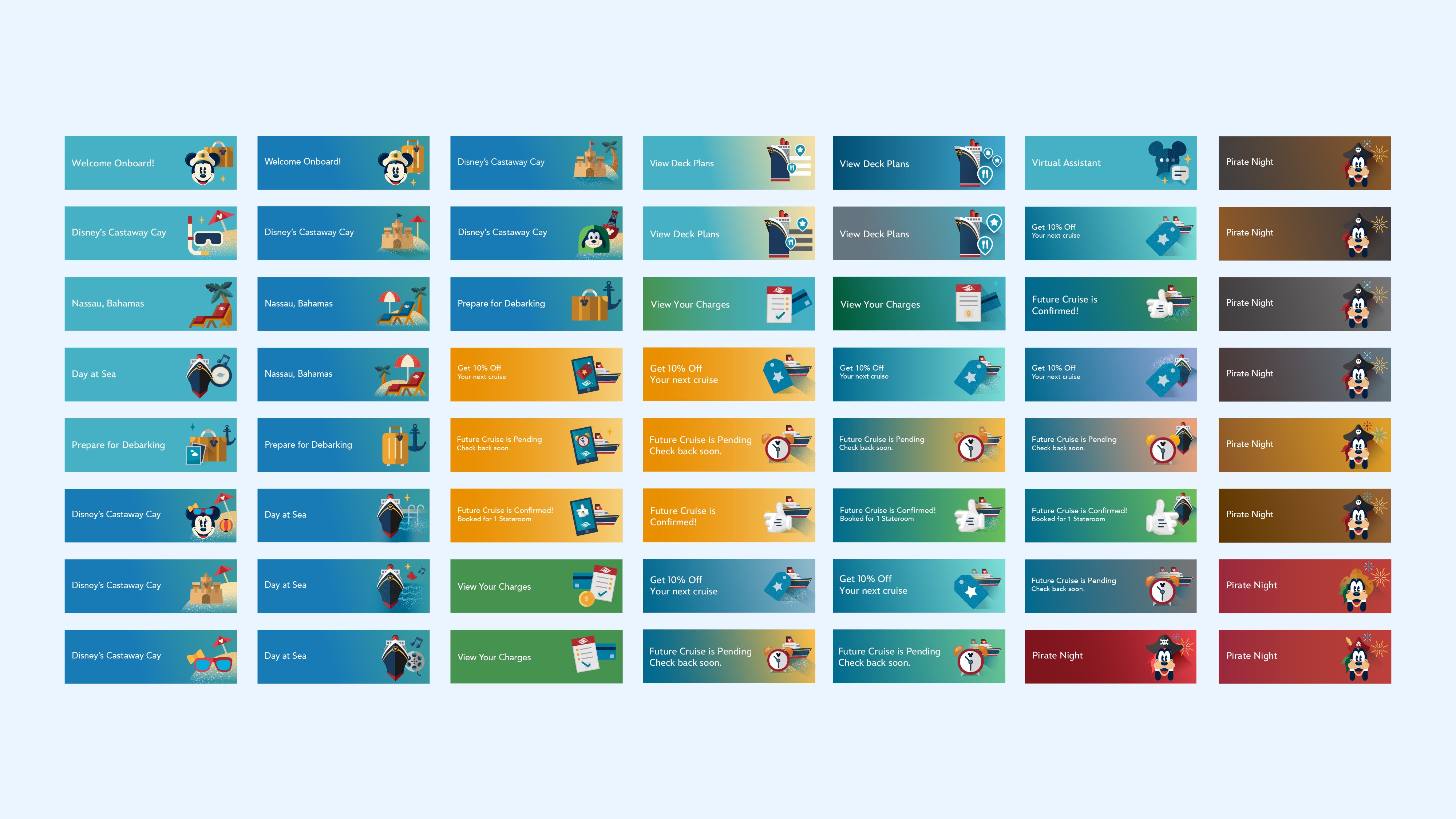 Illustrations were thoughtfully created based on distinct themes, including onboard experiences, debarking, Disney islands, sea-based activities, and special occasions. Background gradients featured subtle variations of sea-inspired blues, greens, and reds, carefully chosen to complement each illustration's color scheme and reinforce the overall oceanic theme.