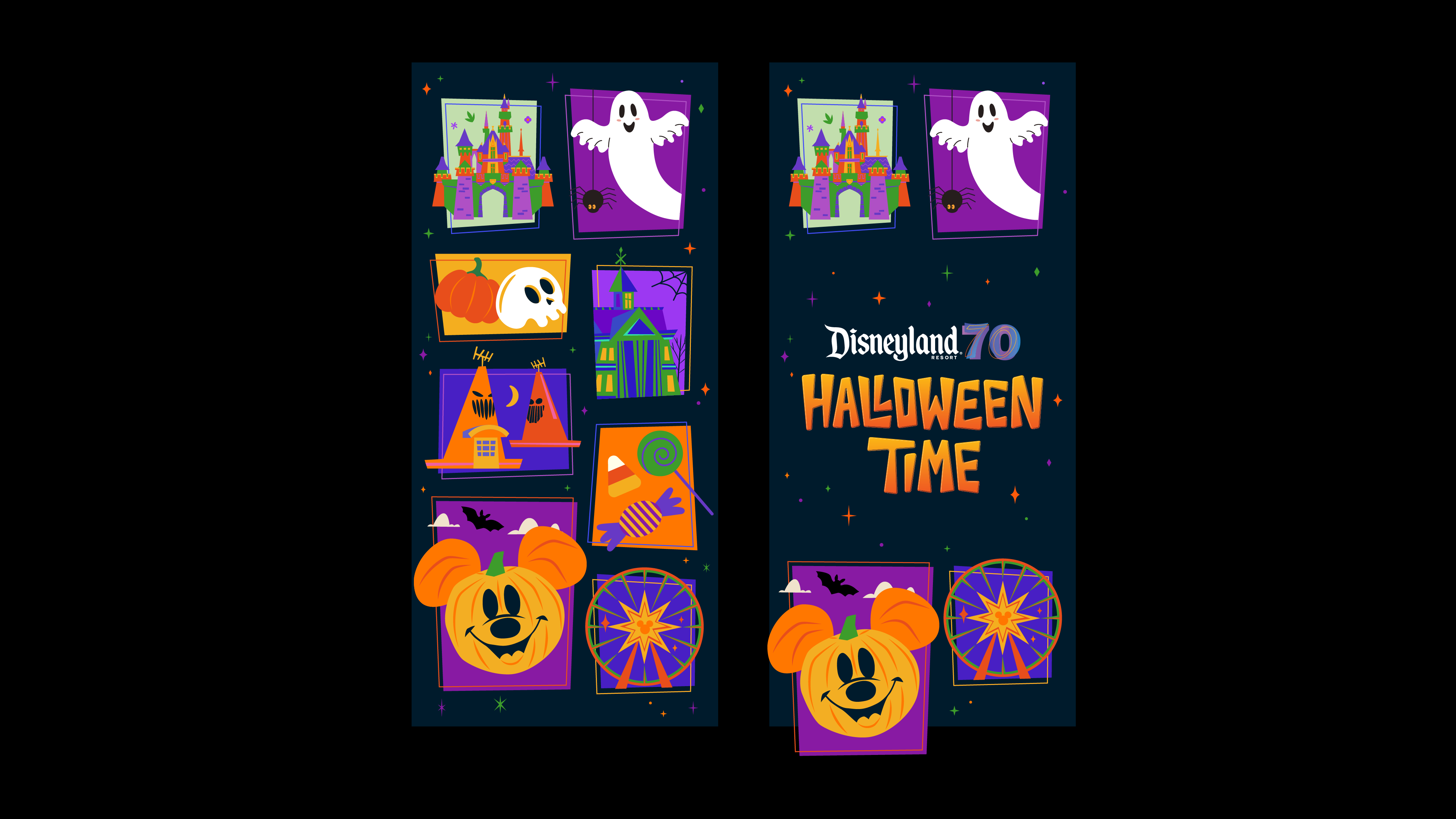 Storyboard created for a 2-second in-app splash video celebrating Disneyland’s 70th Anniversary Halloween Time event. Incorporated the official 70th anniversary branding elements, including logo and visual motifs, while featuring iconic Halloween-themed rides and approachable seasonal graphics to quickly capture attention and convey the festive spirit.